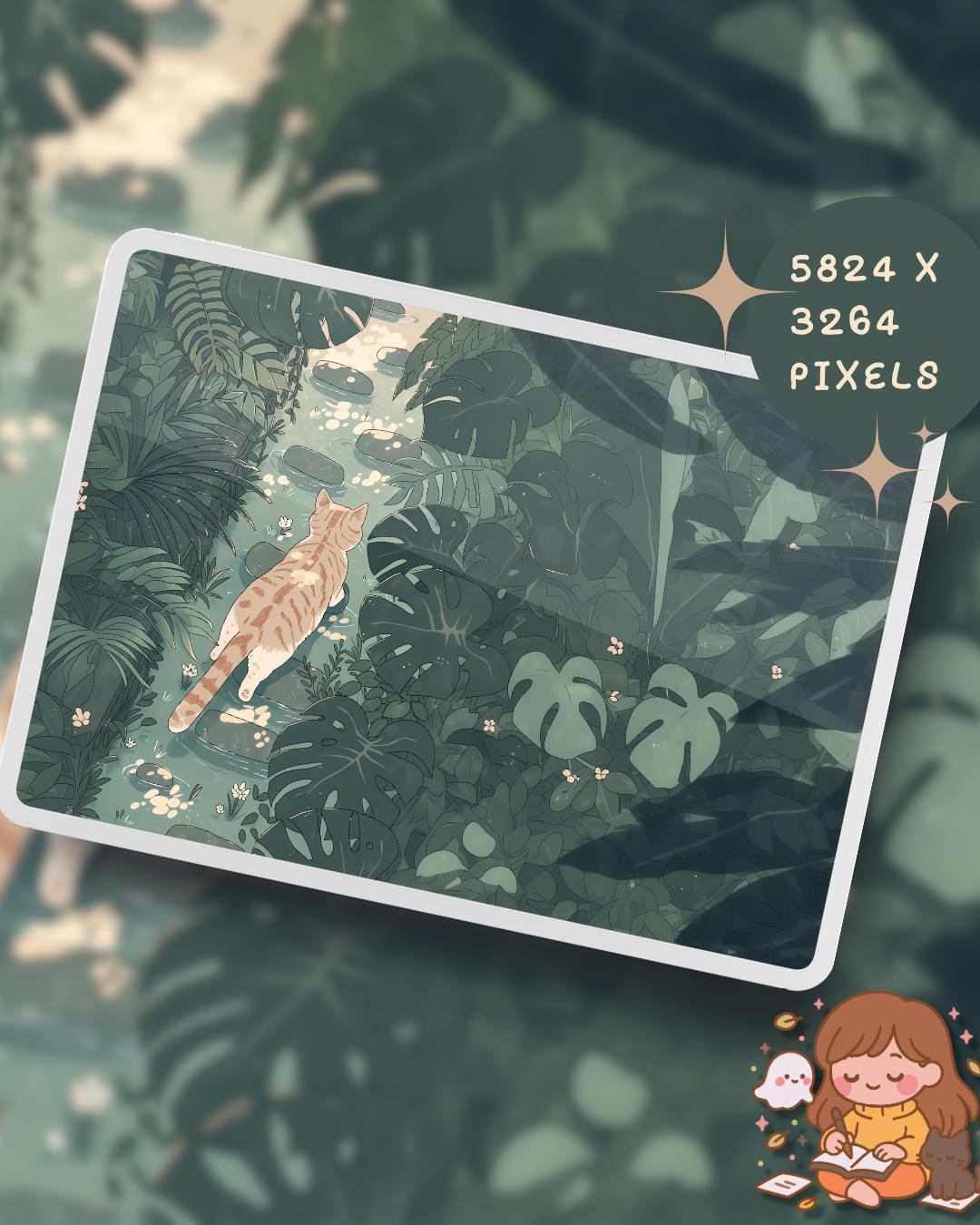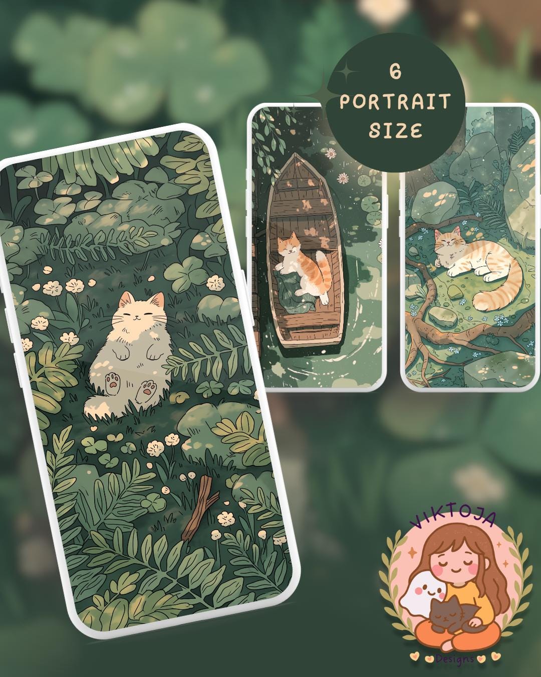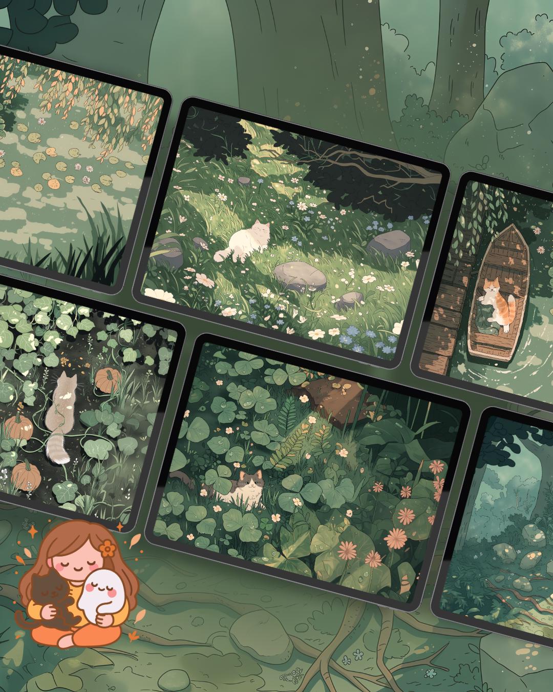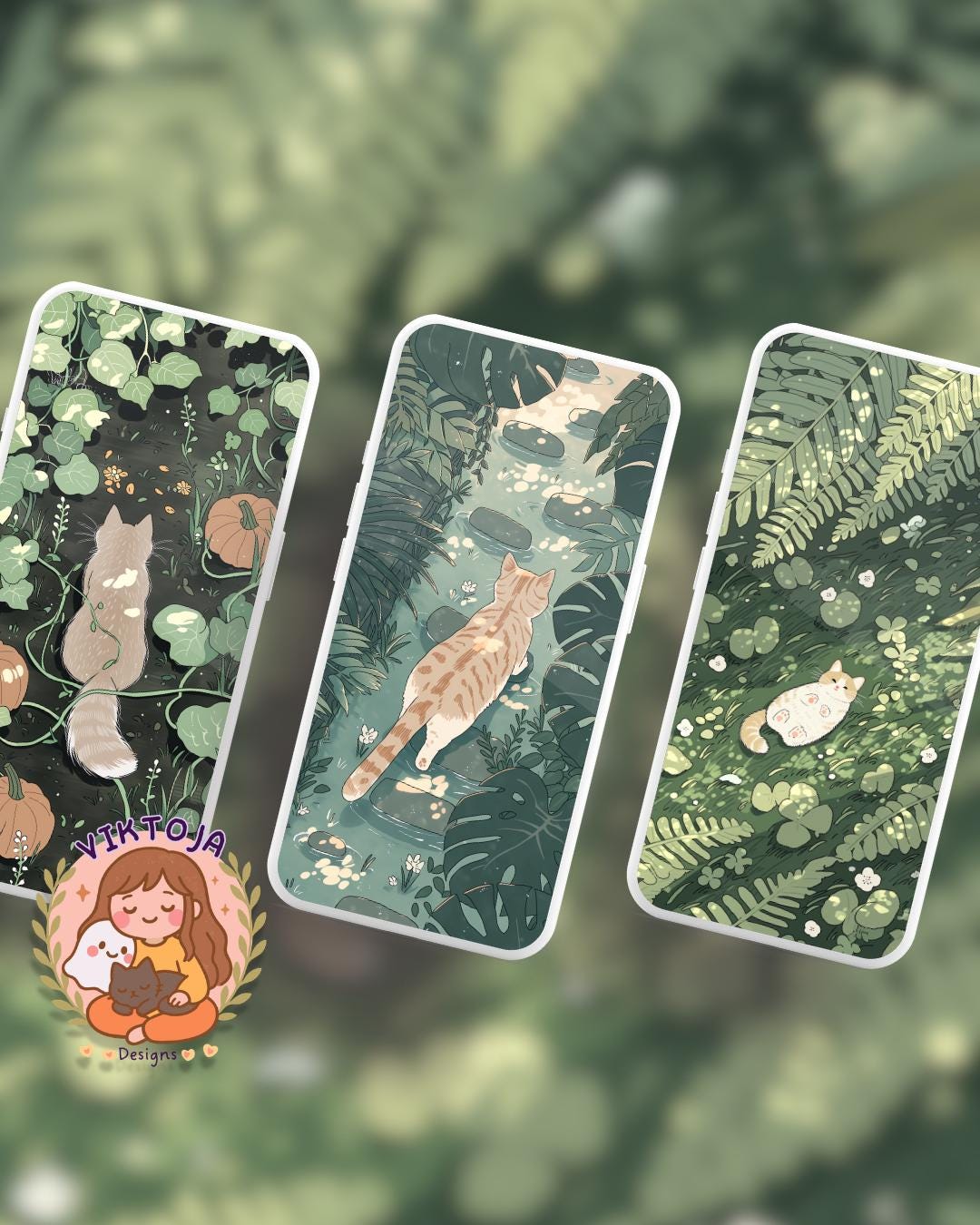 Top down Cats Wallpaper Set: greens and nature (Digital Download)