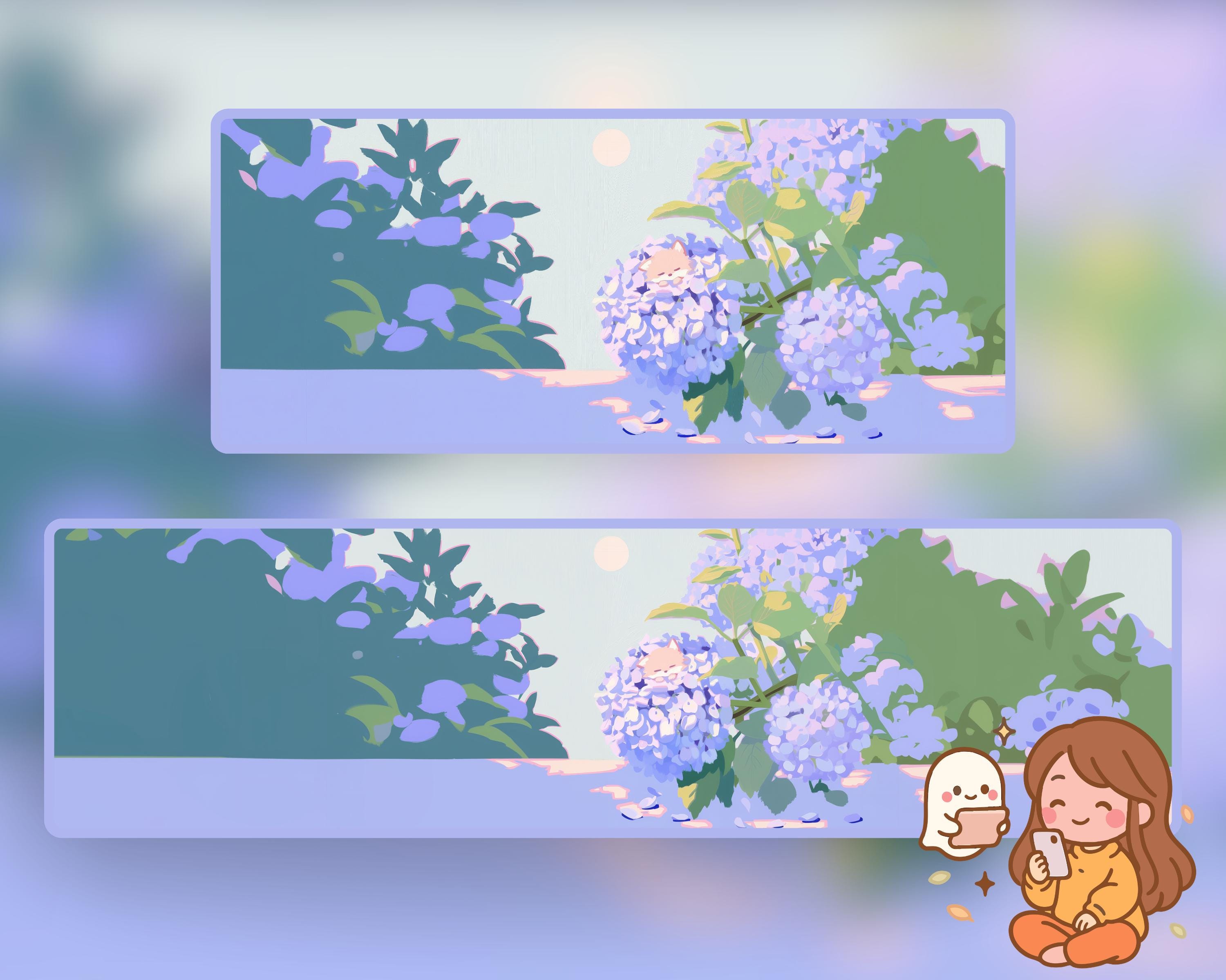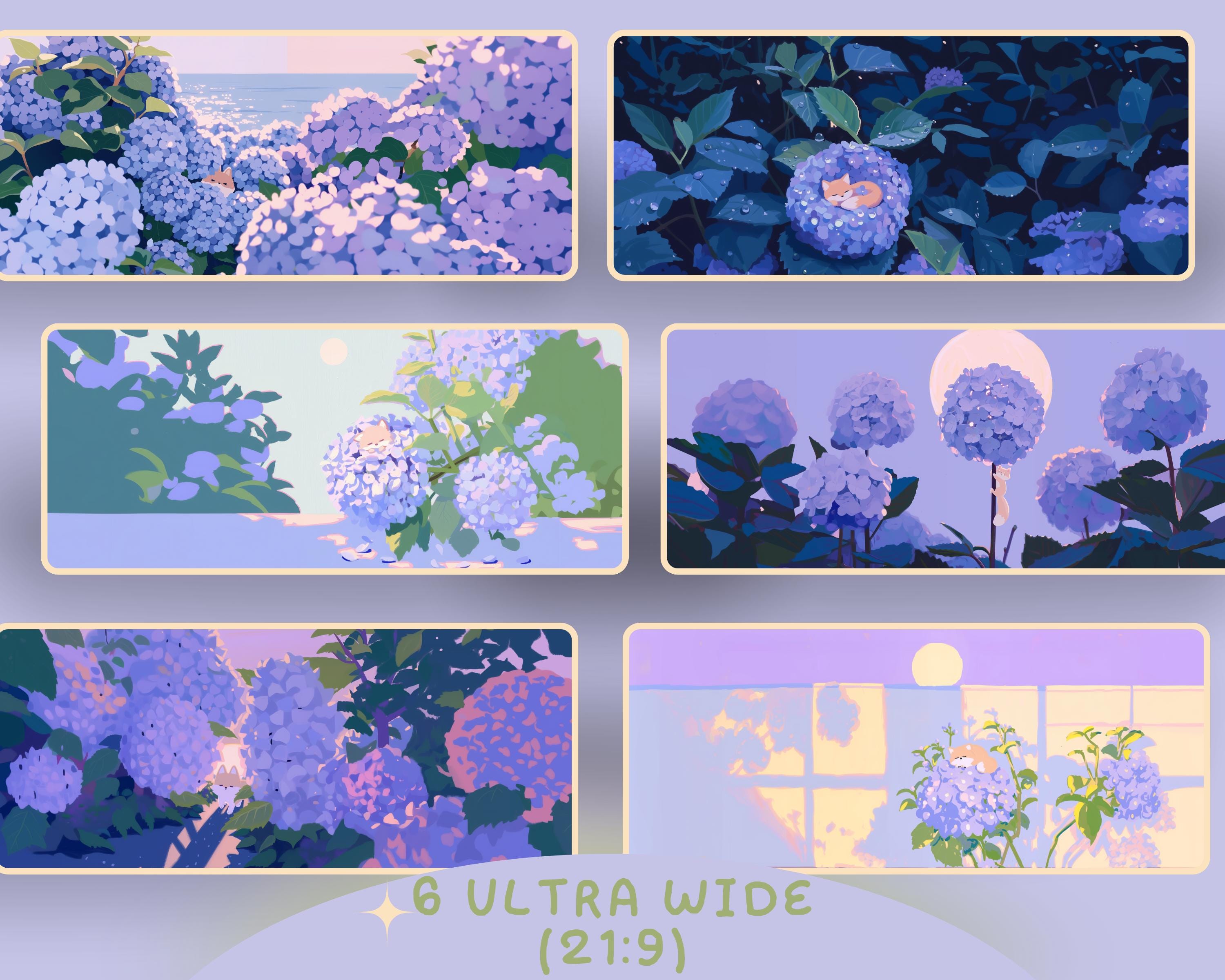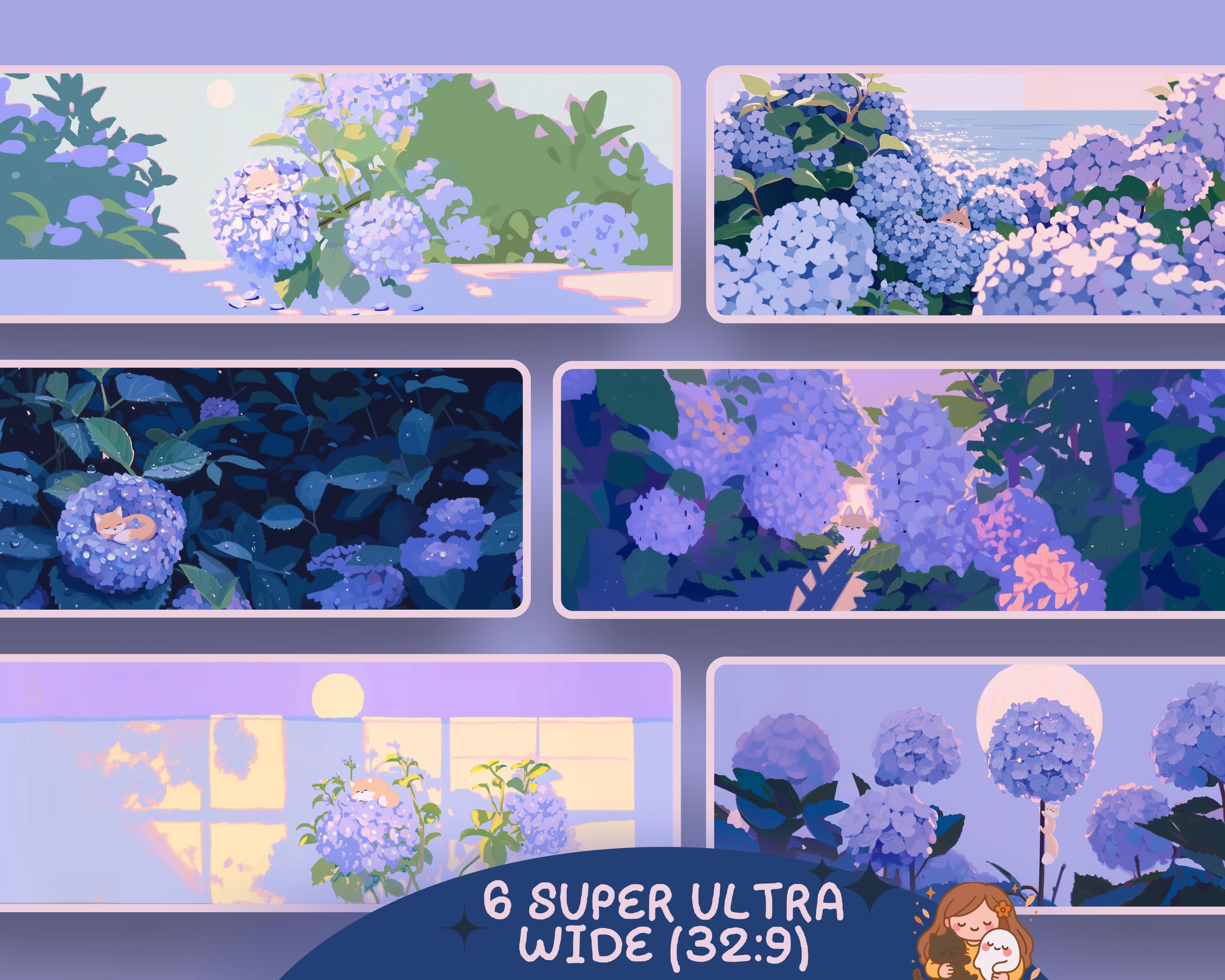 blue hydrangea fox kawaii Ultrawide Wallpaper Set Desk Setup Desktop for 21:9 32x9