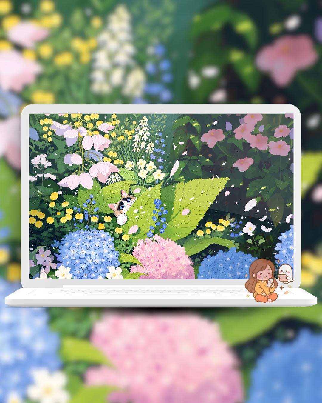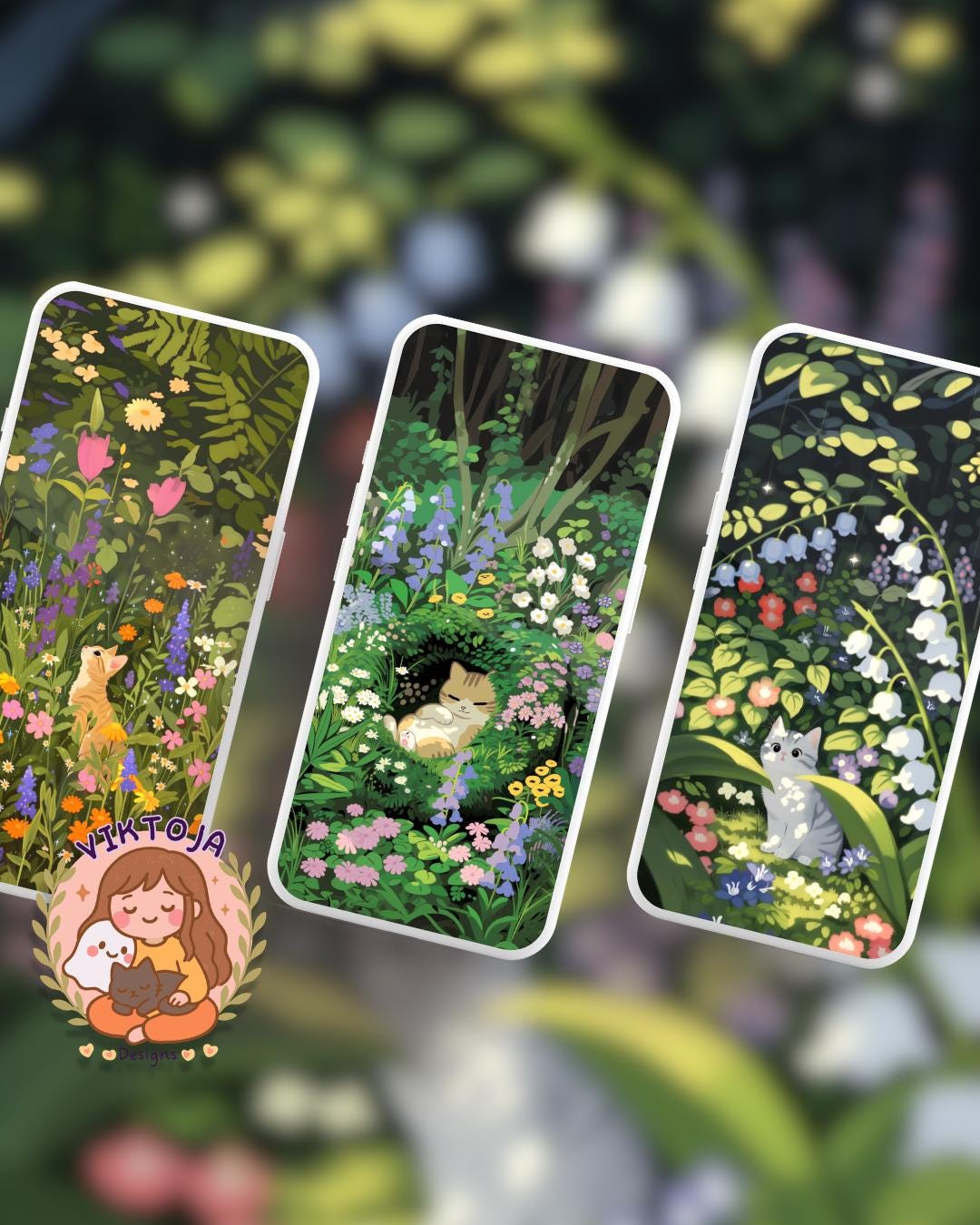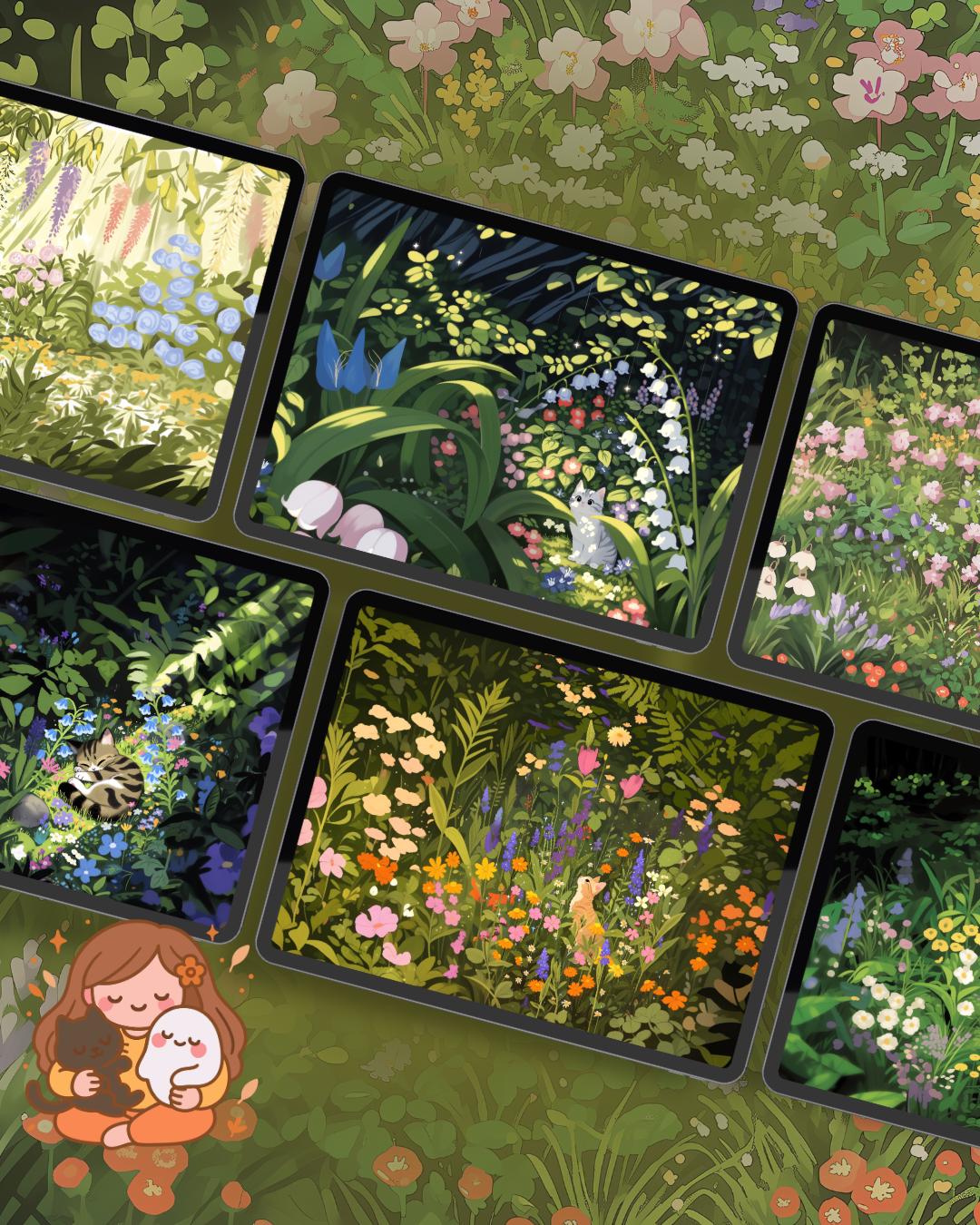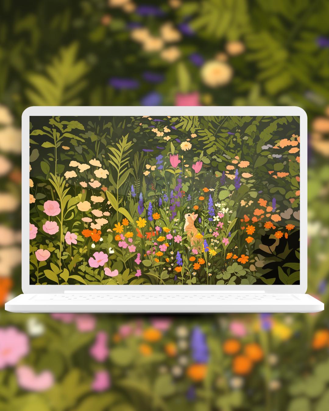 Spring Flower cats Wallpaper: colorful Desktop & Phone Backgrounds (Digital Download)