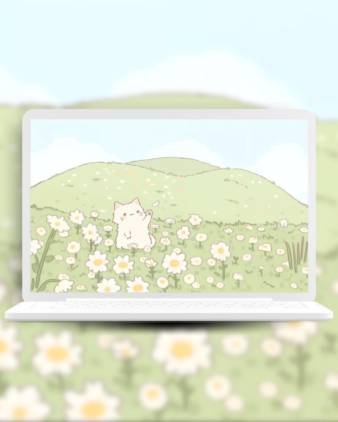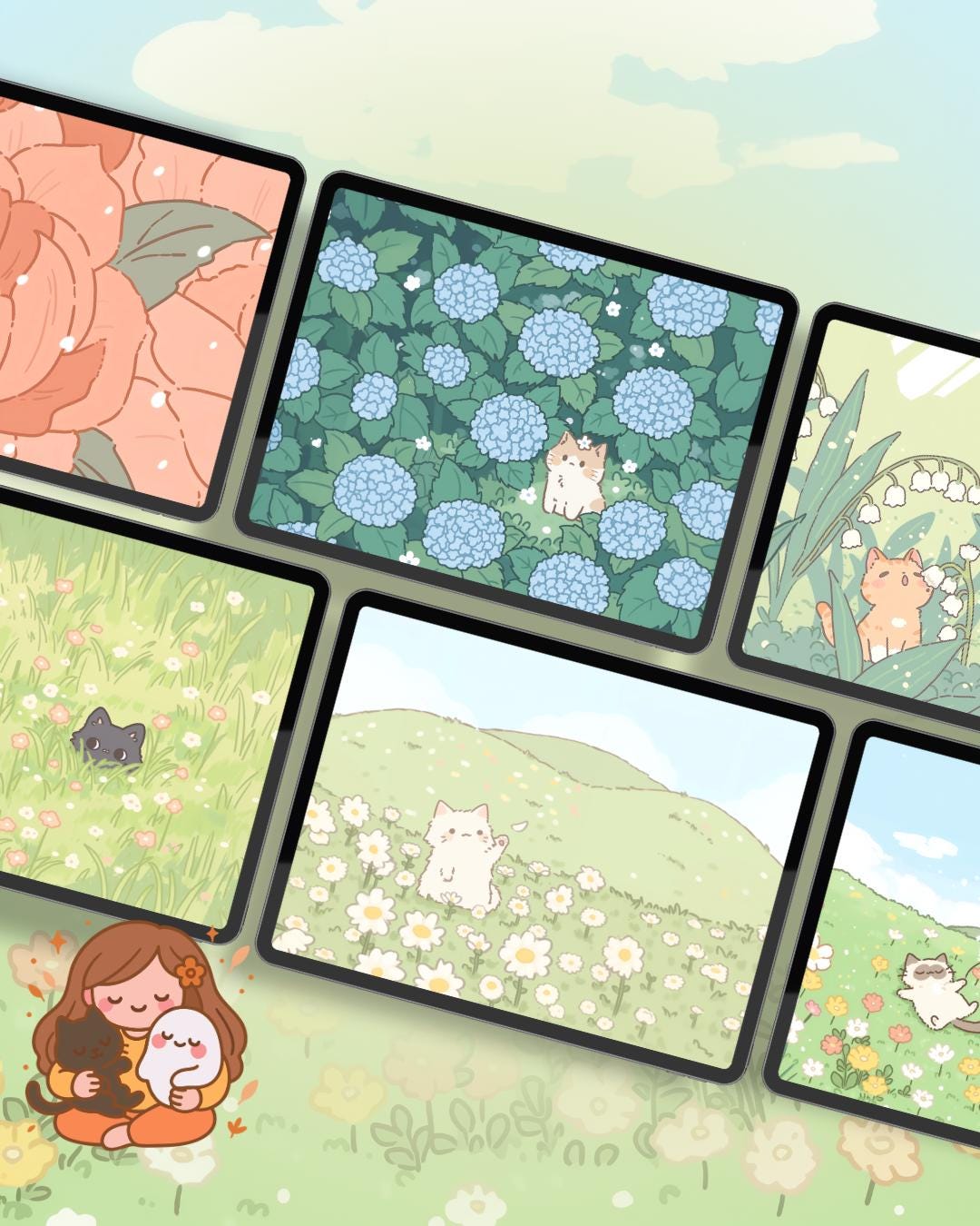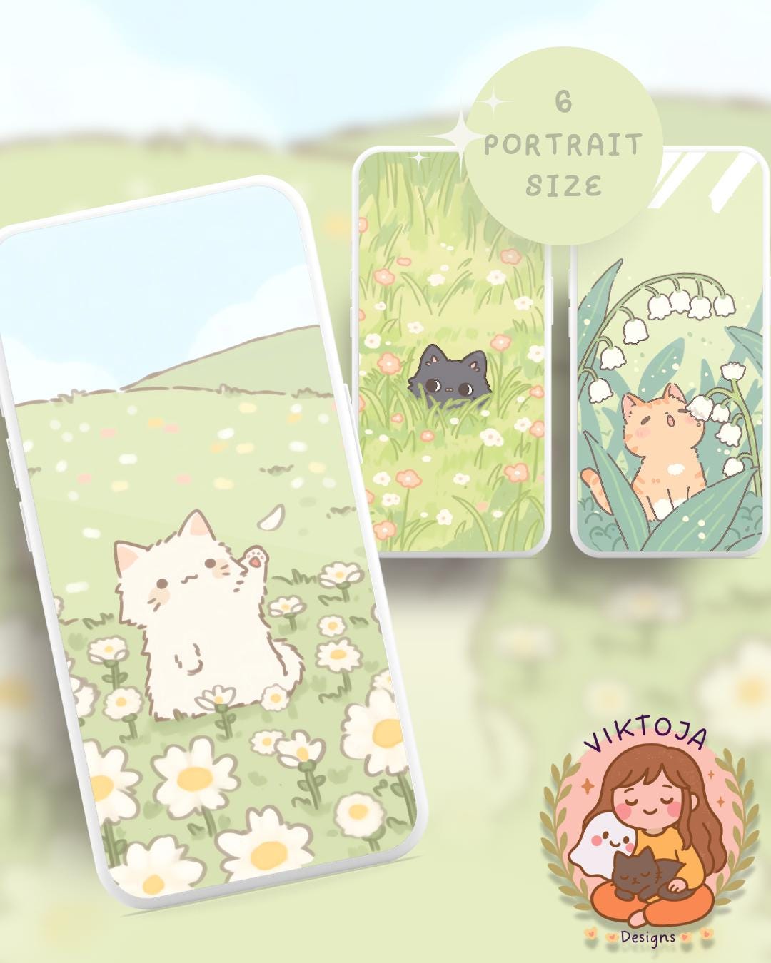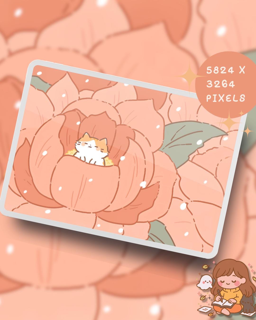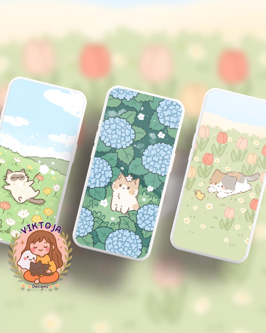 Kawaii spring Flower cats Wallpaper: Pastel Pink Desktop & Phone Backgrounds (Digital Download)