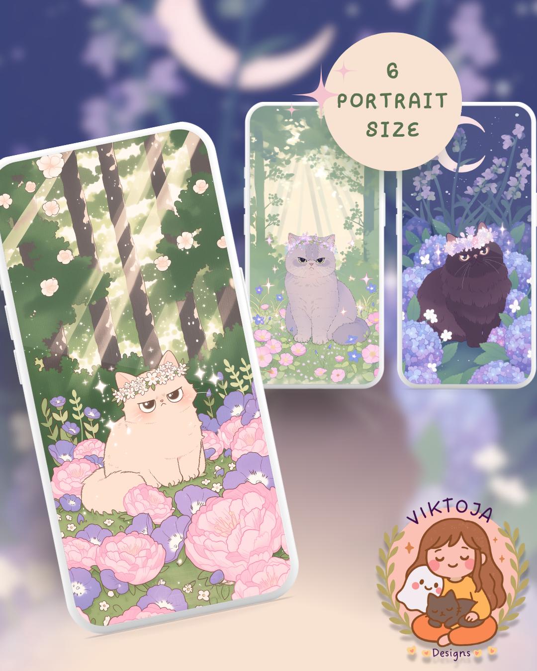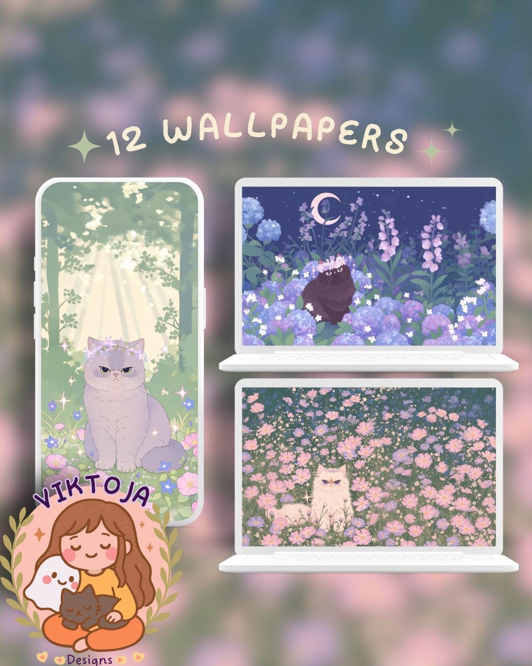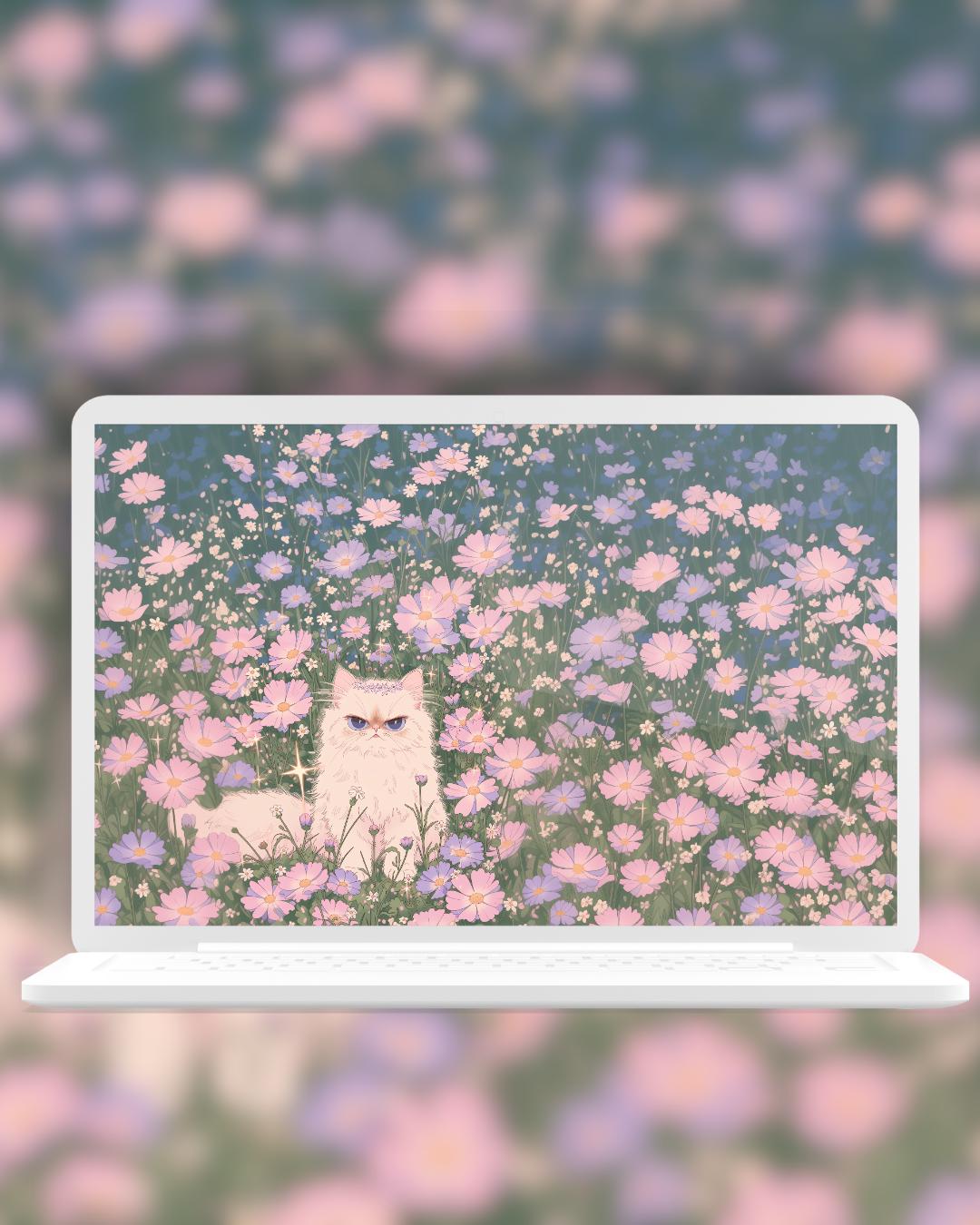Angry Spring Cats Kawaii Wallpaper: Pastel Pink Desktop & Phone Backgrounds (Digital Download)